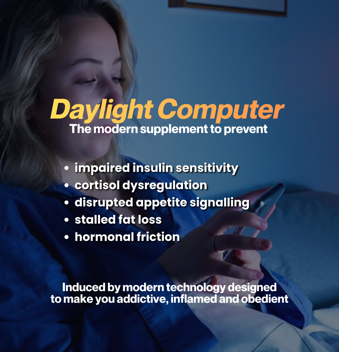 A daylight-aligned computer removes the problem upstream — before you need supplements, filters, or protocols. First principles. Takes you outside and winds you down in the evening.