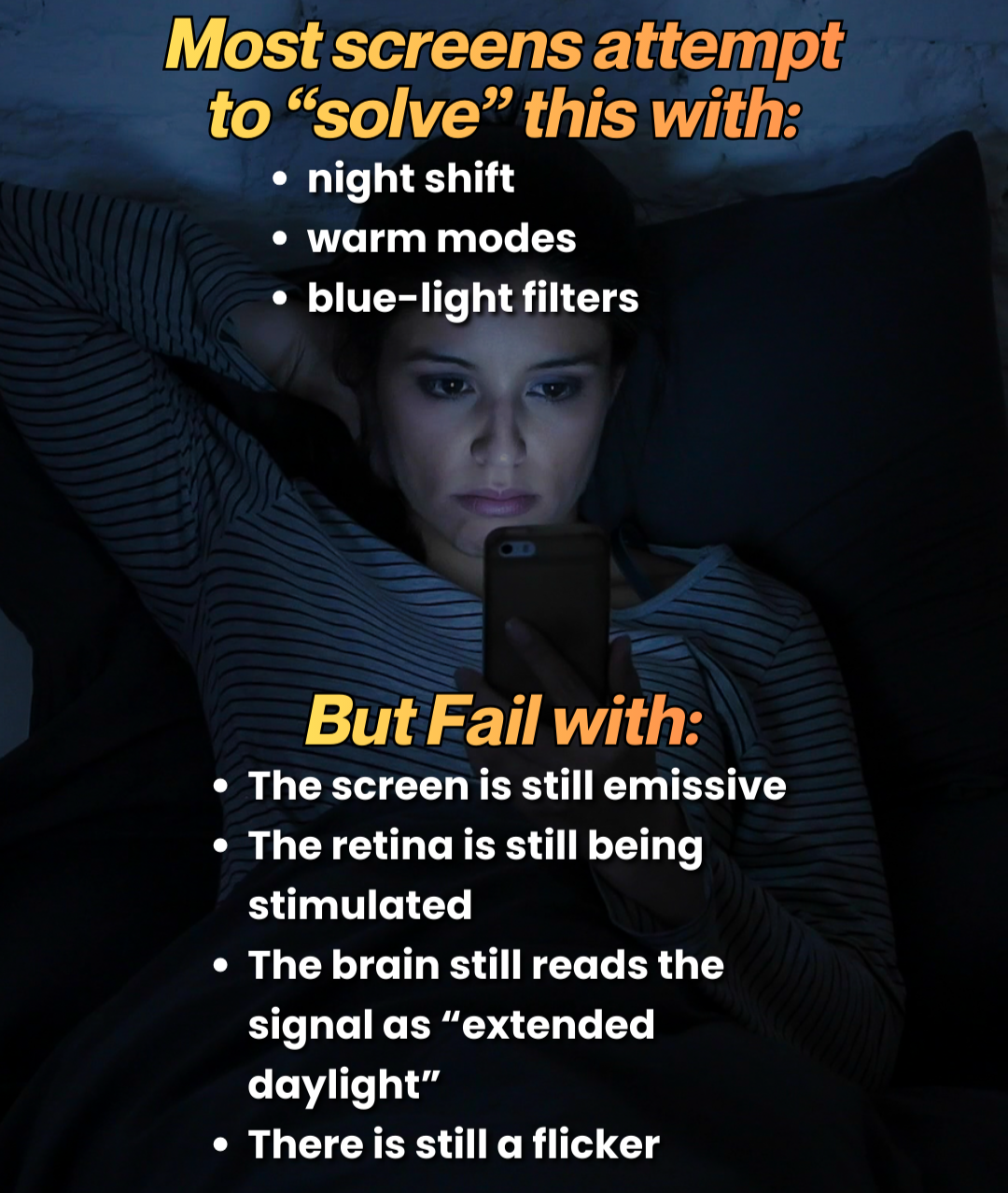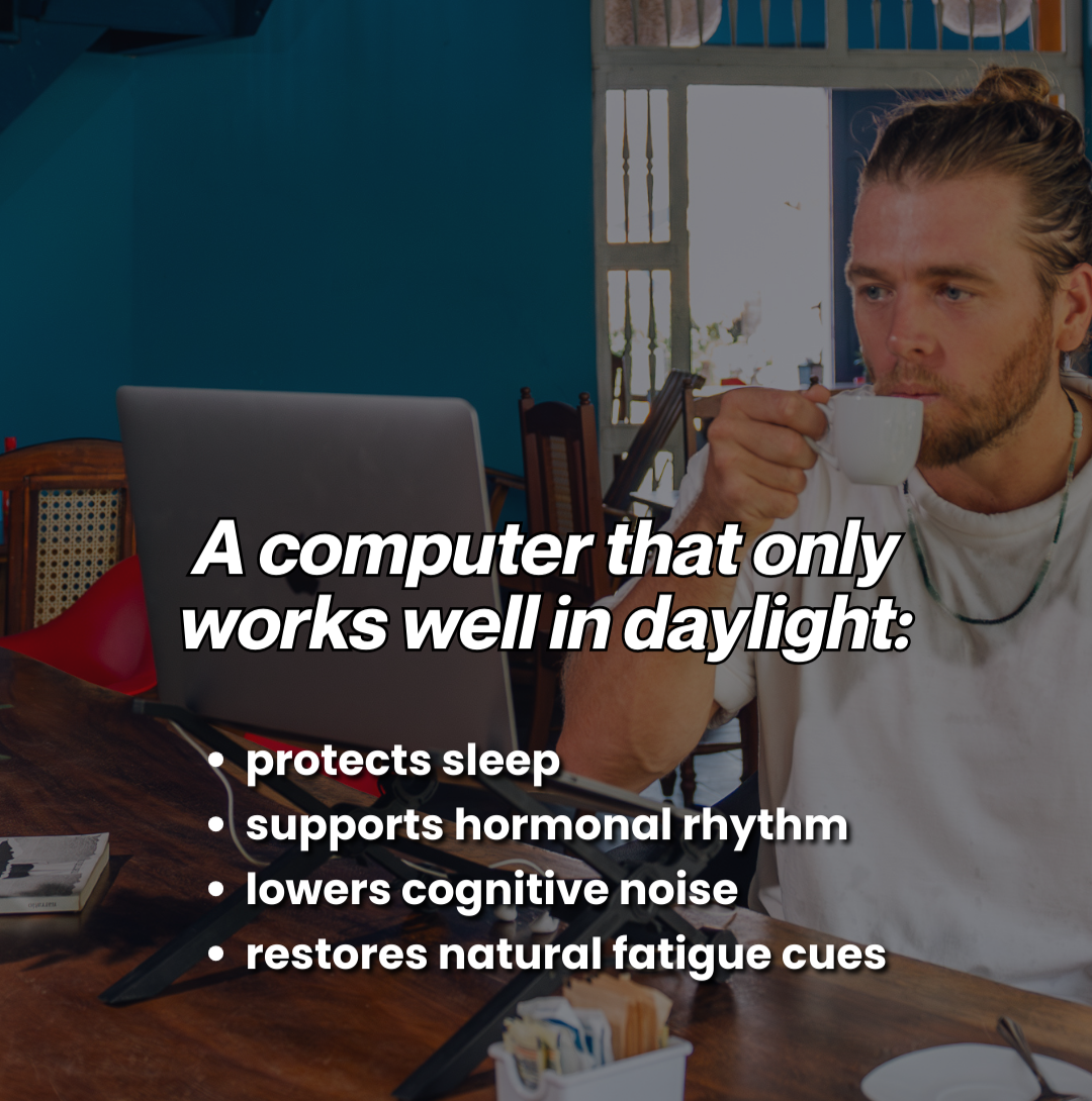A computer that only works in daylight matters because it directly supports sleep quality, hormones, eye health, and your nervous system. Instead of trying to make late-night screens “less bad” with filters and night modes, the Daylight Computer changes the light environment completely.